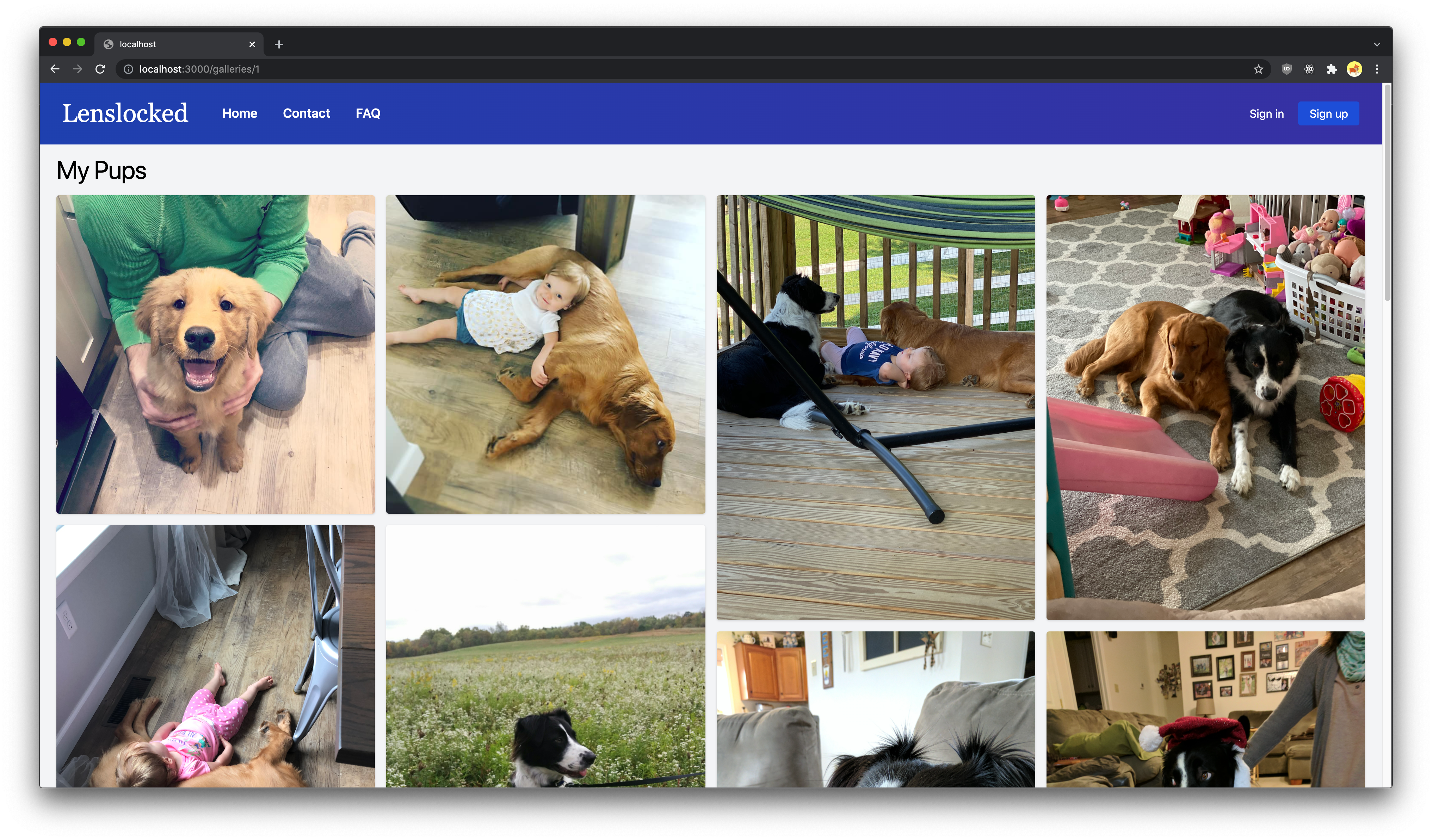 Throughout the course you will be building LensLocked, a photo sharing application. Users can sign up, create galleries, and upload photos to create a gallery. After a gallery is completed it can be published, making it publicly accessibly to anyone with the URL.